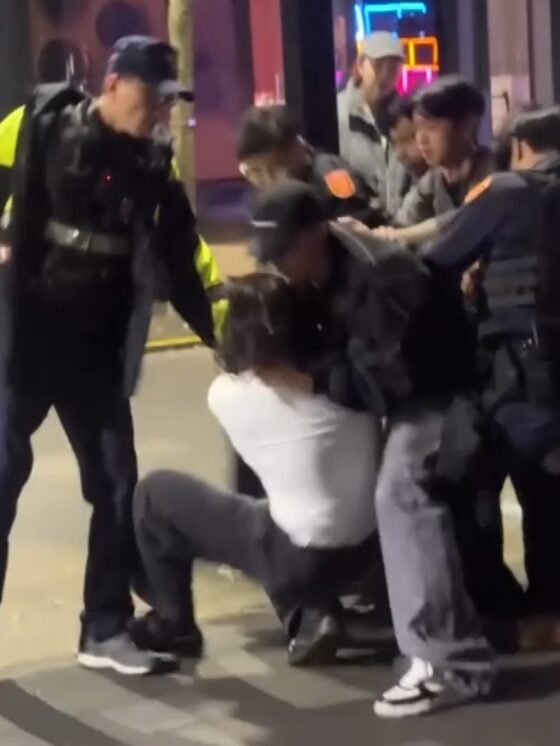 後來我男生朋友看不下去,從後面撞他一下,我朋友已經把項鍊纏在手上,但我朋友看到這肩寬、手臂、身高覺得還是包一包,我朋友沒有直接跟他幹起來,警察及時趕到架住他,一開始架的不是很住,他就像開啟狂暴模式跟一頭牛一樣左甩又甩,後來支援到了10幾個壓他一個,對他噴辣椒水,他才被壓制住。