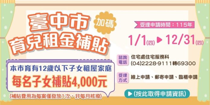 為減輕台中市育有0至12歲子女的租屋家庭負擔,台中市政府運用囤房稅稅收辦理「台中市育兒租金補貼」,自明年1月1日起至12月31日受理申請。台中市住宅發展工程處表示,凡在台中市租屋且符合財稅規定的市民,每名0至12歲子女可獲新台幣4,000元補助,且補助子女數不設上限,即便承租社會住宅的市民亦可申請,全面照顧台中市育兒家庭,補貼戶數上限約為1萬6,240戶,額滿截止。