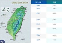 今天12月25日聖誕節、明天26日,受到大陸冷氣團南下及其影響,中部以北及東北部、東部天氣轉冷,其他地區早晚亦冷,請注意保暖;因水氣增多,桃園以北及東北部地區有短暫雨,並有局部較大雨勢發生的機率,北部、東部、東南部地區及恆春半島、馬祖有局部短暫雨,中南部山區有零星短暫雨,其他地區及澎湖、金門為多雲的天氣,相關地區的民眾出門請帶雨具。