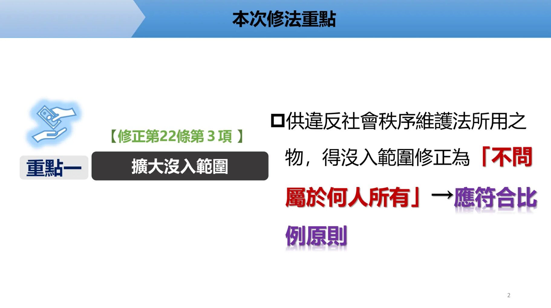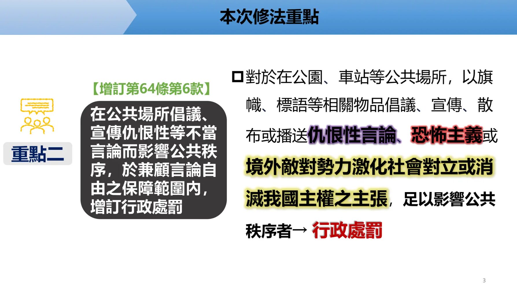 (二)對於在公園、車站等公共場所,以旗幟、標語等相關物品倡議、宣傳、散布或播送仇恨性言論、恐怖主義或境外敵對勢力激化社會對立或消滅我國主權之主張,足以影響公共秩序者,予以處罰。(修正條文第64條)