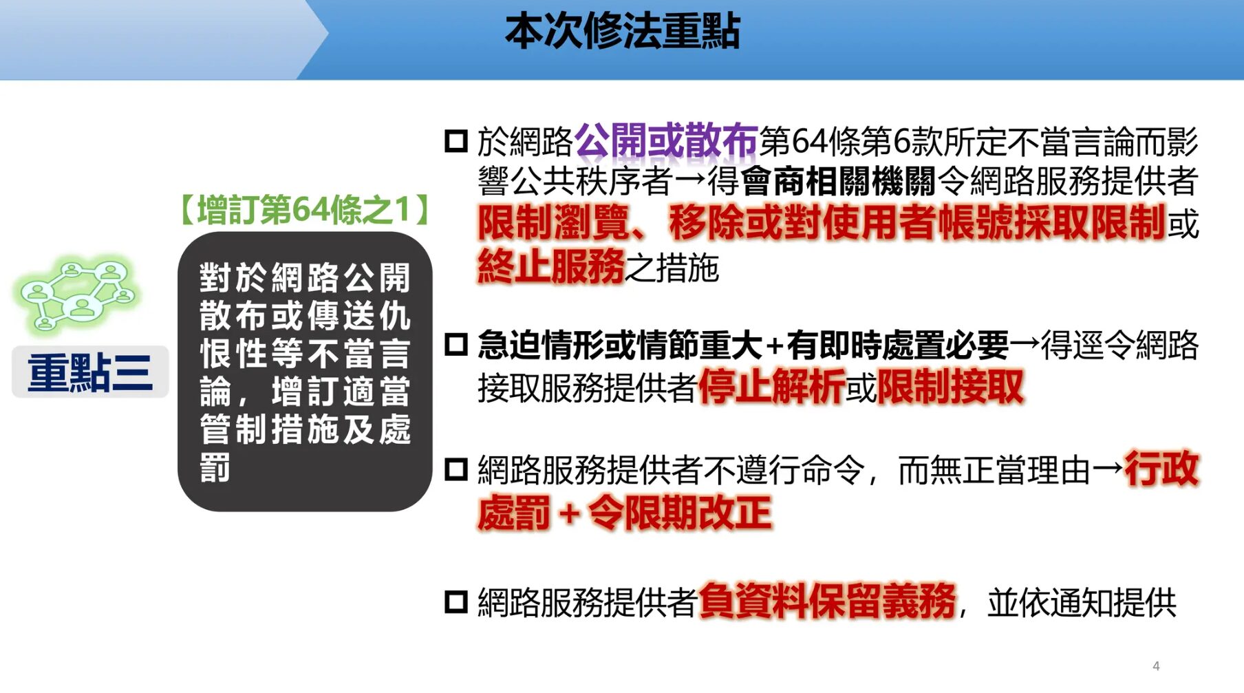 (三)以網際網路公開倡議、宣傳、散布或播送仇恨性言論、恐怖主義或境外敵對勢力激化社會對立或消滅我國主權之主張,足以影響公共秩序者,內政部得令相關網路服務提供者或網際網路接取服務提供者採取特定處置或措施,及不遵行該等處置或措施之處罰。(修正條文第64條之1)