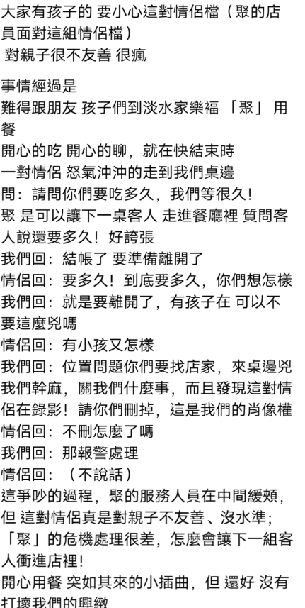 網友在Threads發文指出,跟朋友孩子們到淡水家樂福「聚」用餐,快結束時一對情侶怒氣沖沖沖的走到桌邊問要吃多久我們等很久,我們回:「結帳了要準備離開了」,情侶回:「要多久!到底要多久,你們想怎樣」我們回:「就是要離開了,有孩子在可以不要這麼兇嗎」情侶回:「有小孩又怎樣」我們回:「位置問題你們要找店家,來桌邊兇我們幹麻,關我們什麼事,而且發現這對情侶在錄影!請你們刪掉,這是我們的肖像權」情侶回:「不刪怎麼了嗎」我們回:「那報警處理」情侶回:「(不說話)」。這爭吵的過程,聚的服務人員在中間緩頰,但這對情侶真是對親子不友善、沒水準,「聚」的危機處理很差怎麼會讓下一組客人衝進店裡。