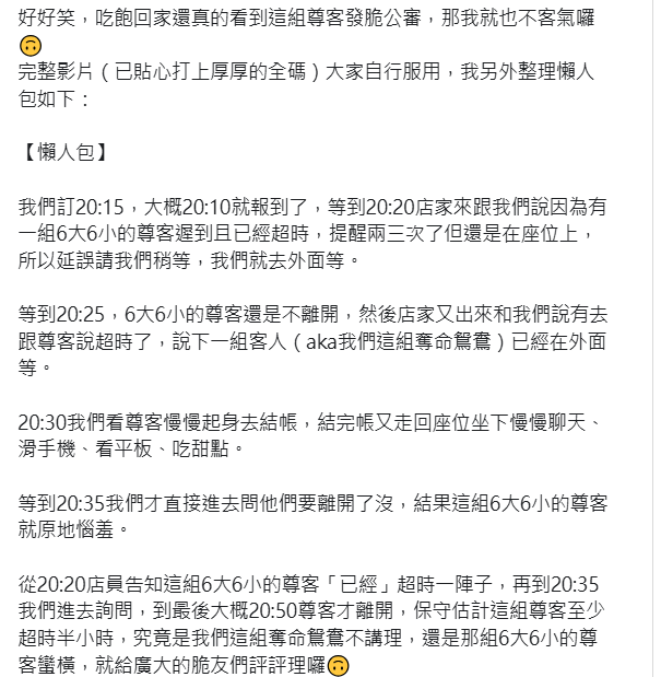 等到20:25,6大6小的尊客還是不離開,然後店家又出來和我們說有去跟尊客說超時了,說下一組客人已經在外面等。20:30我們看尊客慢慢起身去結帳,結完帳又走回座位坐下慢慢聊天、滑手機、看平板、吃甜點。等到20:35我們才直接進去問他們要離開了沒,結果這組6大6小的尊客就原地惱羞。從20:20店員告知這組6大6小的尊客「已經」超時一陣子,再到20:35我們進去詢問,到最後大概20:50尊客才離開,保守估計這組尊客至少超時半小時,究竟是我們這組奪命鴛鴦不講理,還是那組6大6小的尊客蠻橫,就給廣大的脆友們評評理囉。
