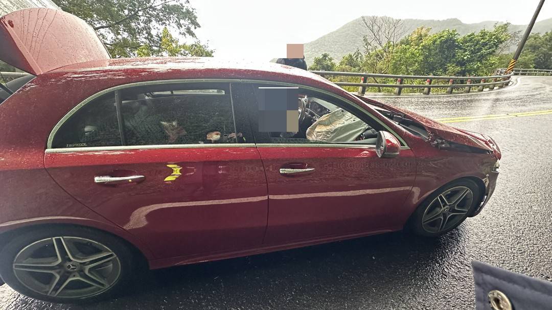 賓士車被落石砸中車頭毀損。翻攝畫面