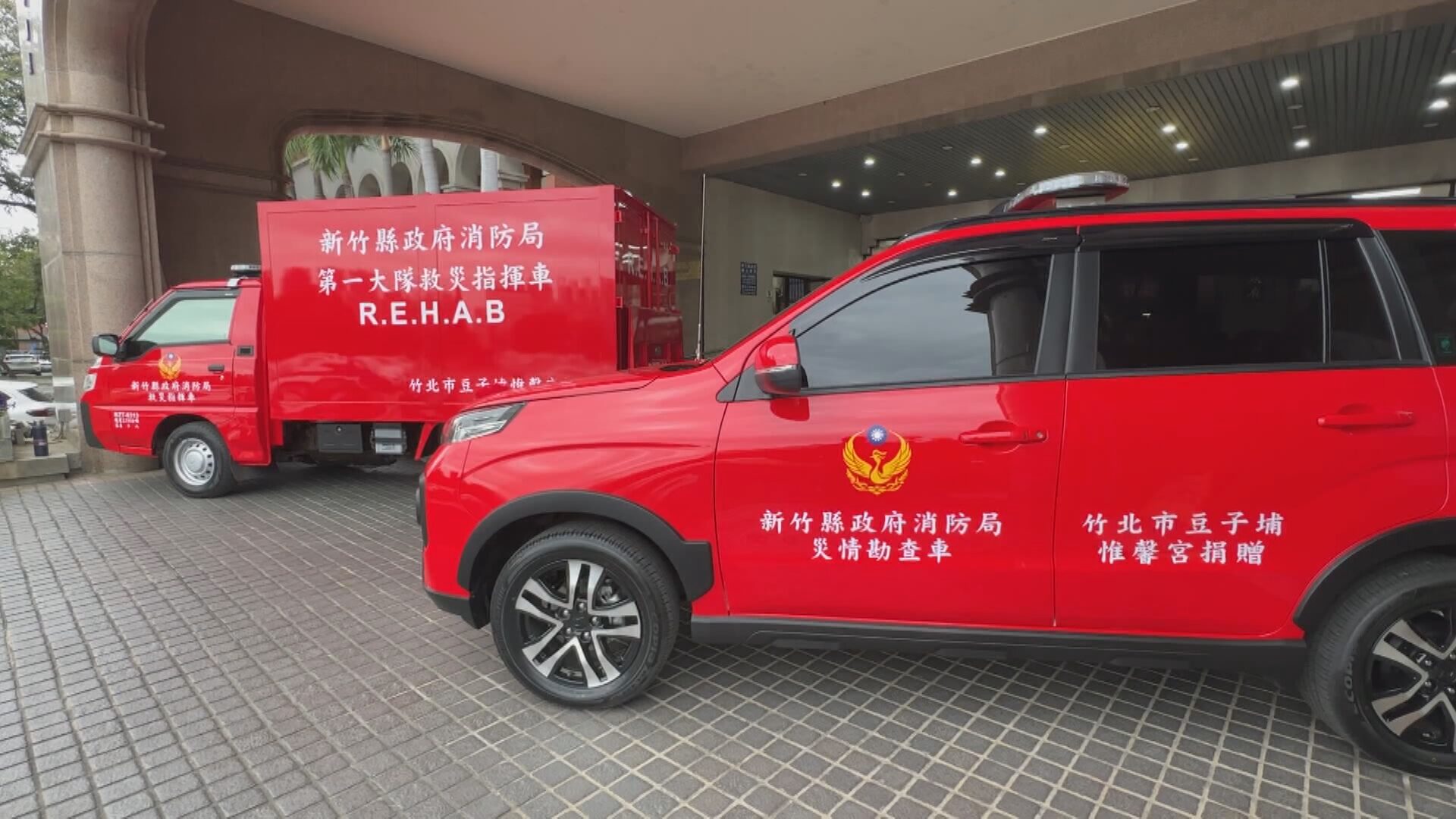 鮮紅色外觀的消防車輛一字排開相當亮眼,竹北市豆子埔惟馨宮香火鼎盛在與消防局討論捐贈消防器材時,深感消防弟兄在執行救災任務時面臨安全和挑戰,經委員開會商討後捐贈三部消防車輛以及器材。