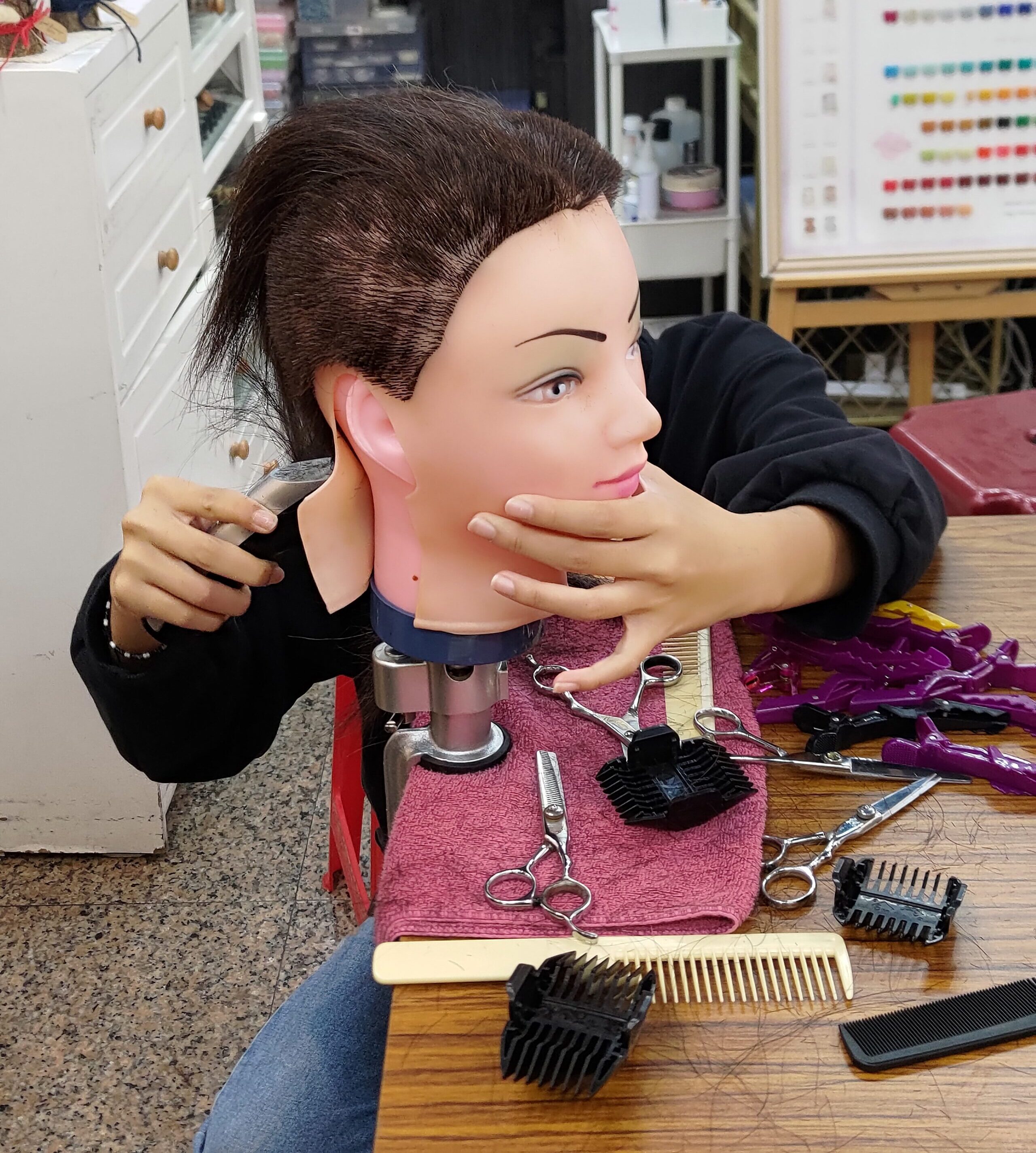 最後,學員實際進行假人頭平剪練習,從分區、定位到剪裁逐步操作,在講師即時指導與修正下,學習手感控制與線條整齊度,理解基礎剪髮技術對後續造型變化的影響。