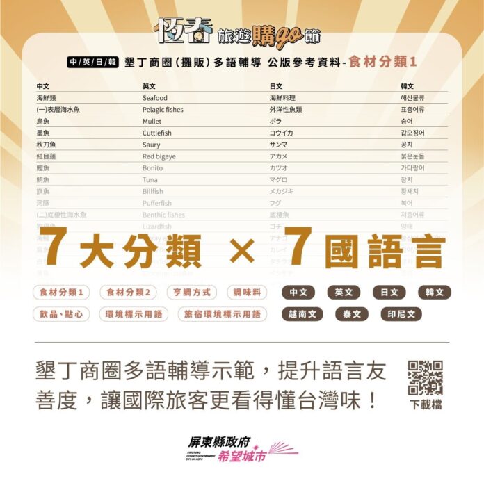 除一對一示範輔導外,縣府亦同步製作「公版7國語言菜單參考模板」,涵蓋中文、美式英文、日文、韓文、印尼文、泰文及越南文等7種語言,提供墾丁商圈市集攤販及商圈業者自由參考使用,降低業者自行翻譯的門檻,擴大多語友善效益,讓政策資源能被更多店家實際運用。