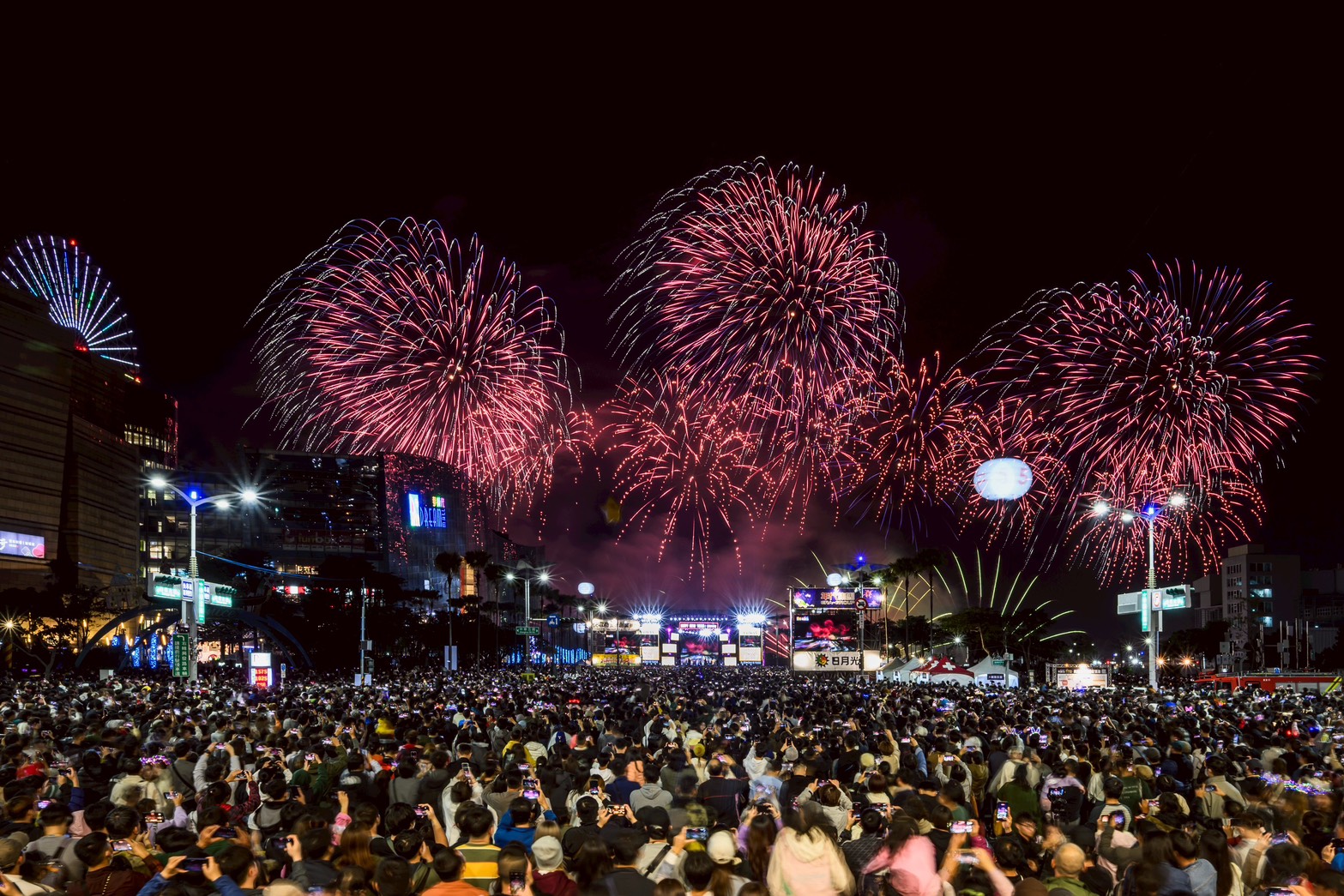240秒亞灣跨年煙火,搭配2025年到高雄開唱的BLACKPINK歌曲〈JUMP〉與TWICE的〈ONE SPARK〉,帶領粉絲的心再回到世運。(圖/高市府提供)