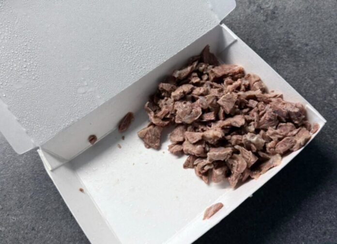 民眾用外送平台點麵店的嘴邊肉,110點了四份,送到的時候半個便當盒不到,讓他傻眼。