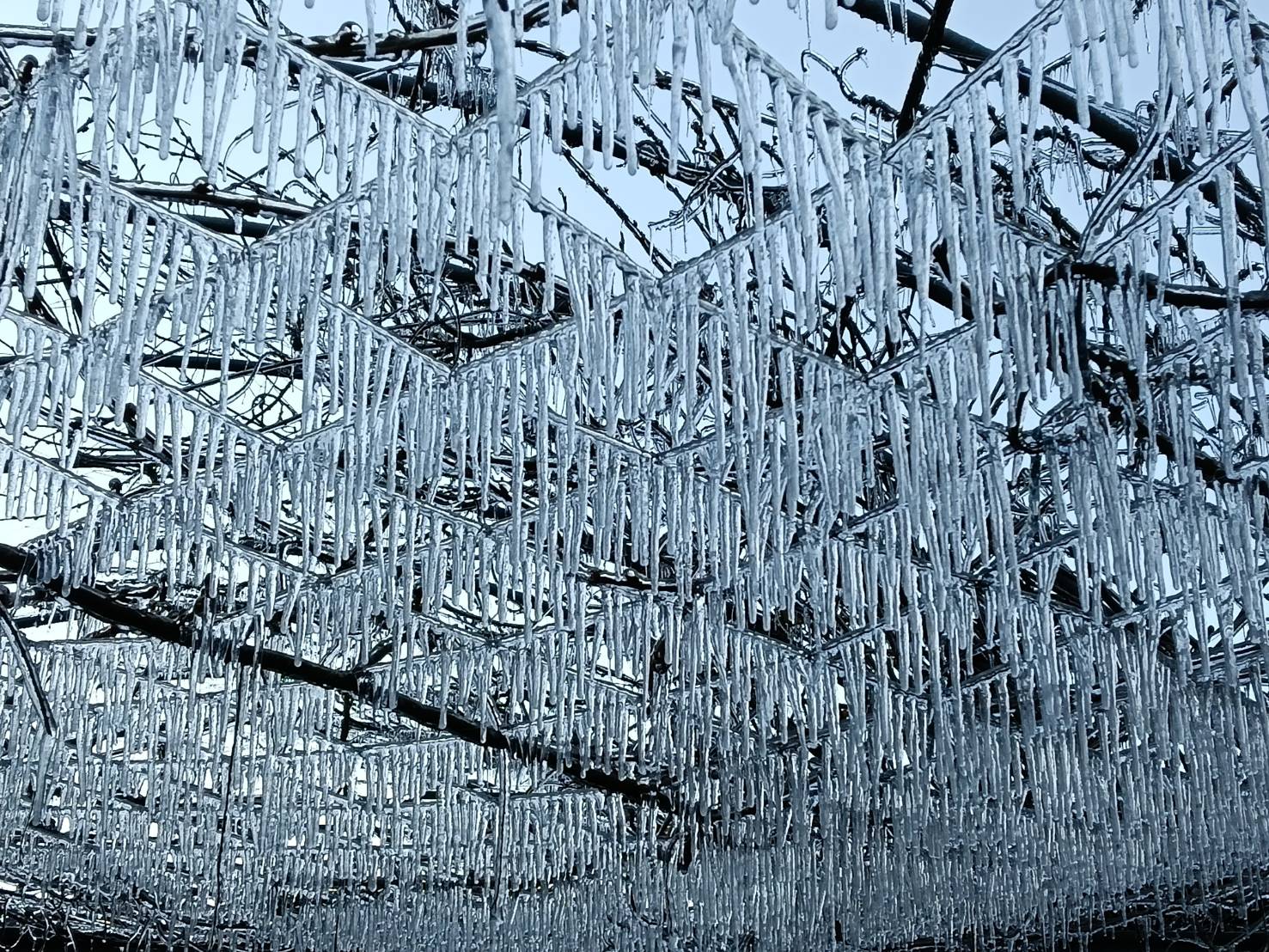 武陵農場表示,今天清晨7時氣溫一度下探至攝氏零下1.2度,在晴朗無雲的條件下,輻射冷卻效應特別明顯。當自動灑水系統啟動時,水滴在低溫中迅速凝結,形成冰珠、冰晶與細長冰柱,層層垂掛,宛如「冰晶簾」,整座藤花園瞬間變身水晶冰宮。