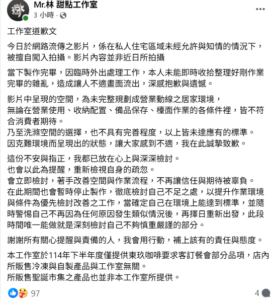 Mr.林 甜點工作室也回文表示,影片是在私人住宅區域未經允許與知情的情況下,被擅自闖入拍攝。影片內容並非近日所拍攝。當下製作完畢,因臨時外出處理工作,未能即時收拾整理好剛作業完畢的雜亂,造成讓人不適畫面流出,深感抱歉與遺憾。