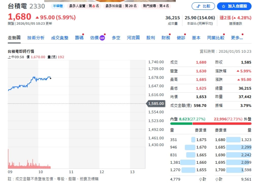 【Lai傳媒、記者爆料網/林千允/綜合報導】受台積電(2330)股價強勢上攻激勵,早盤來到1680元,今(5)日元大台灣50ETF(0050)盤中買氣全面引爆,大量散戶資金湧入,成交量與股價同步放大。截⾄上午9時56分,0050股價上漲2.35元,來到69.3元,漲幅達3.58%,成交量已突破8.4萬張,市場熱度明顯升溫。
