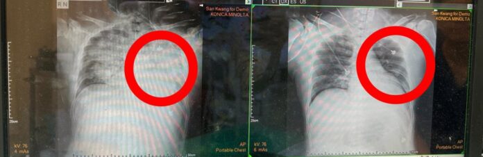 男子於家中飲用珍珠奶茶時,突然發生劇烈嗆咳,隨即出現呼吸困難、臉色發紺, 雙側肺部出現大片浸潤影,顯示已處於嚴重缺氧狀態。豐原醫院提供