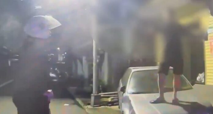警方喝令踩在別人車子引擎蓋上的男子下來。翻攝畫面