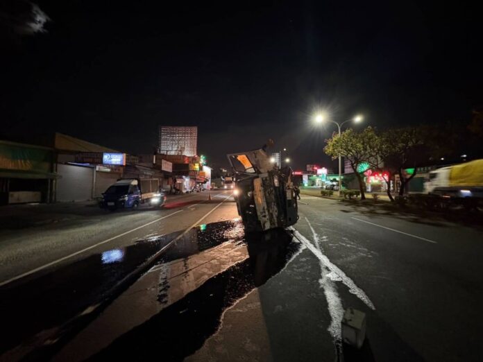 台中市向上路7段發生大貨車自撞中央分隔島側翻事故。翻攝畫面