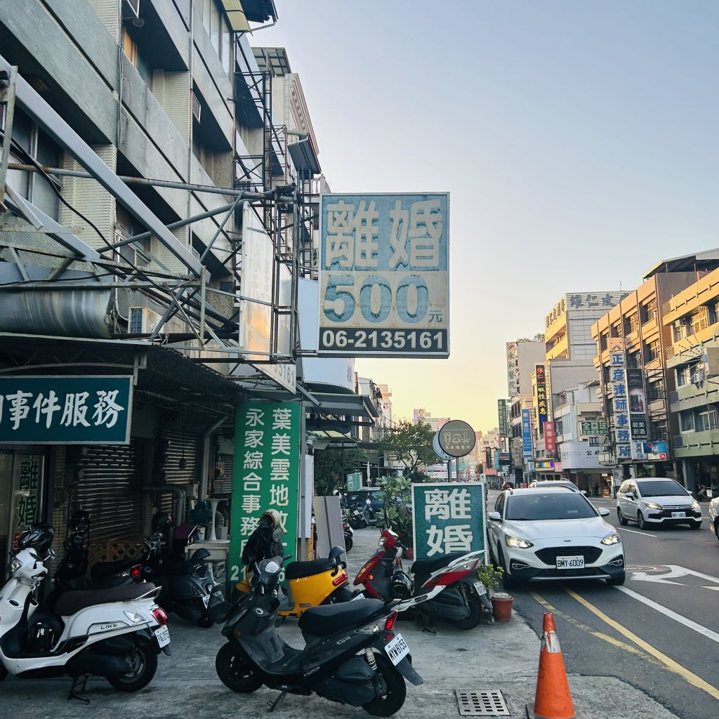據了解,這塊招牌懸掛多年,「500元」主要是協助當事人填寫基本離婚協議書的費用,實際法律諮詢或財產分配等服務需另行計算。台南在地居民表示,雖然招牌簡單,但也意外成了文化交流的趣味象徵,日本遊客看似對「離婚500」特別好奇,甚至有人調侃台南區碼「06」與大阪相同,若撥錯號碼說不定會通到日本。