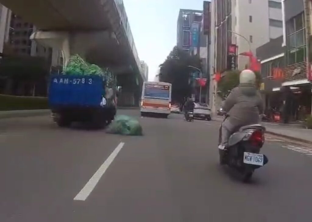 裝回收物的袋子從車上掉落路面。翻攝畫面