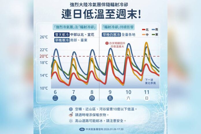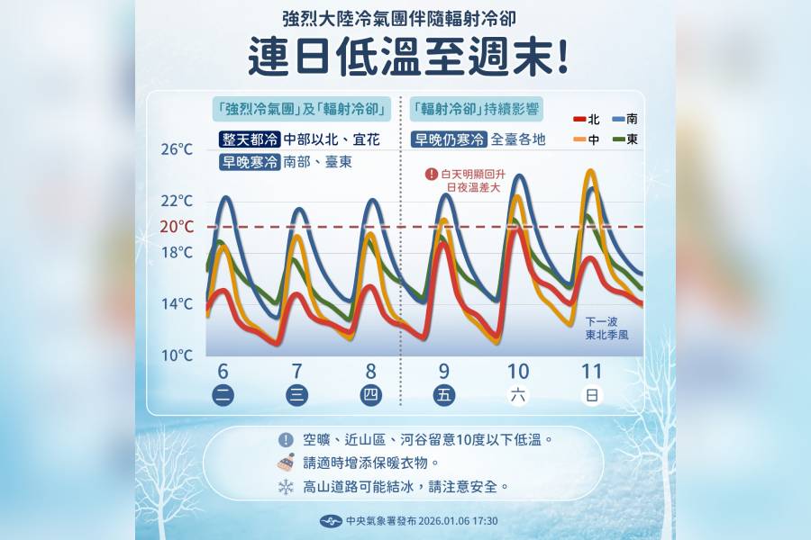 氣象署說明,周三至周四(1/7、1/8)各地為多雲到晴,僅東半部、桃園以北及恆春半島零星雨,但中部以北、宜蘭低溫只有約10、11度,南部、花東、澎湖約12-14度,金門、馬祖約9-11度,並且得留意空曠、近山區及河谷地區及金門、馬祖有10度以下低溫。