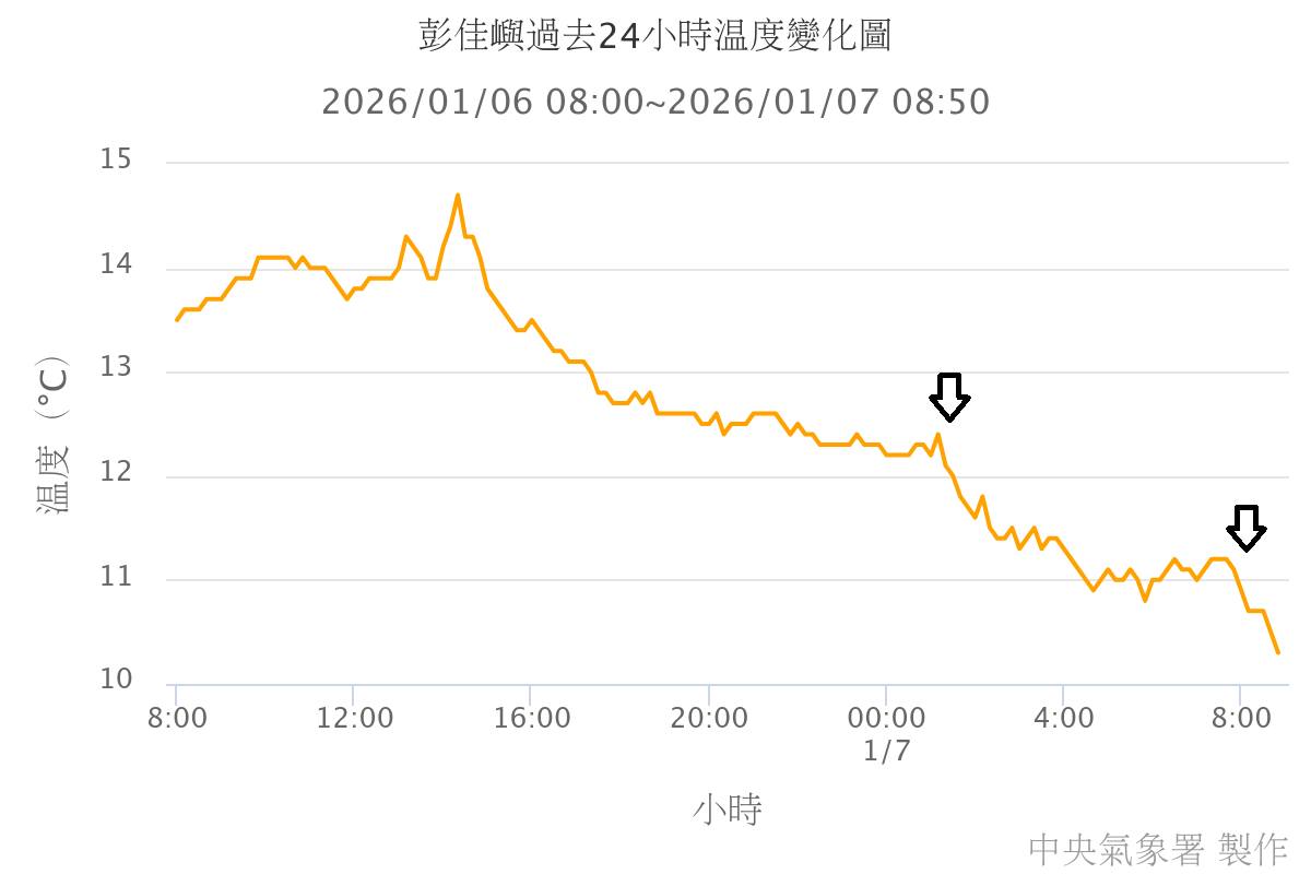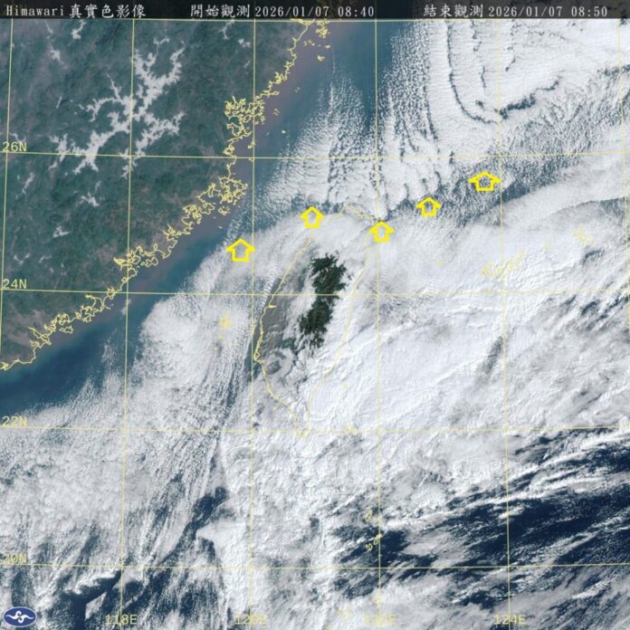 前中央氣象署長鄭明典今天上午9點多也在臉書示警,從衛星雲圖可以看到台灣北方海面出現「雲街」現象。他解釋,雲街是冷空氣流經溫暖海面時形成的特殊雲型,從雲圖上可以看出強冷平流的末段就在台灣北緣,而且彭佳嶼測站已經記錄到兩波乾冷空氣通過。