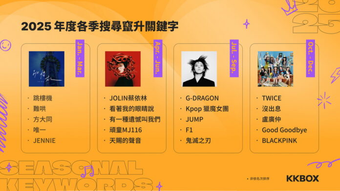 亞洲最大 AI 多媒體科技集團科科科技 KKCompany Technologies 旗下音樂串流平台 KKBOX,今(7)日公布 2025 年度音樂榜單與音樂趨勢觀察。透過平台累積百億次聆聽數據、逾千筆用戶調查,並整合四大語系榜單、影視合作、搜尋熱度與季節性關鍵字,KKBOX 歸納出台灣音樂市場在過去一年呈現出的四大關鍵變化,勾勒出樂迷聆聽行為日益多元、細緻的輪廓。