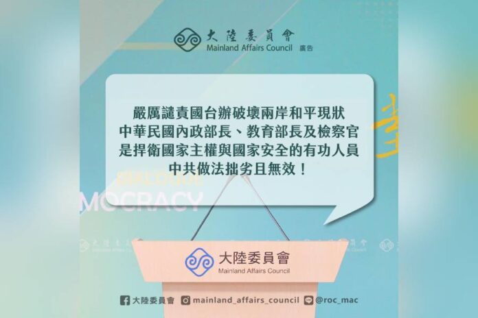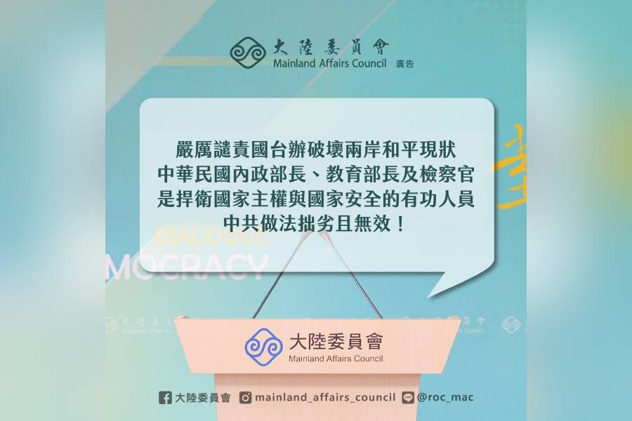 內政部部長劉世芳、教育部部長鄭英耀被國台辦列入「台獨頑固分子」,陸委會嚴厲譴責。圖/大陸委員會臉書