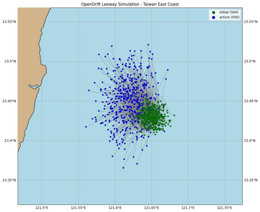 臉書粉專「Taiwan ADIZ」近日分享一張由民間人士製作的「漂移模擬圖」,利用OpenDrift軟體,結合海流與風場資料,推算人員或漂流物可能的移動方向與範圍。模擬圖中以不同顏色標示假想落海點、漂移軌跡及最終可能位置,提供搜救單位作為研判參考。