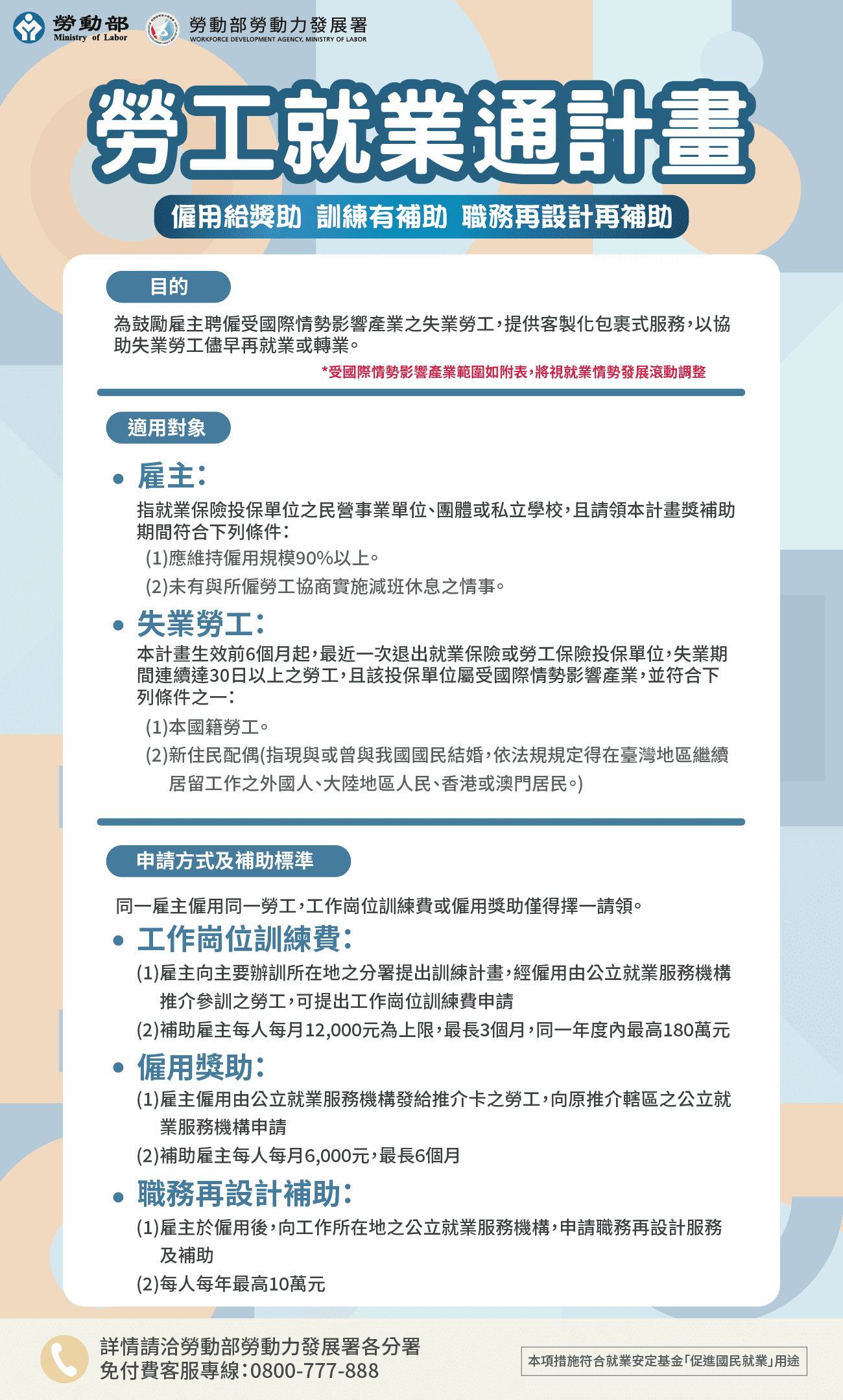 勞動部屏東就業中心翁素足主任表示,勞動部在國際情勢影響下推出「勞工就業通計畫」穩定就業市場,僱用獎助措施補助雇主每人每月新台幣6,000元,最長補助6個月外;企業可針對仍須培訓的求職者,採「先僱後訓」方式,由雇主安排職場導師指導,勞動部補助「工作崗位訓練費」每人每月新臺幣12,000元,最長3個月;更有「職務再設計」協助調整工作條件,排除工作障礙。