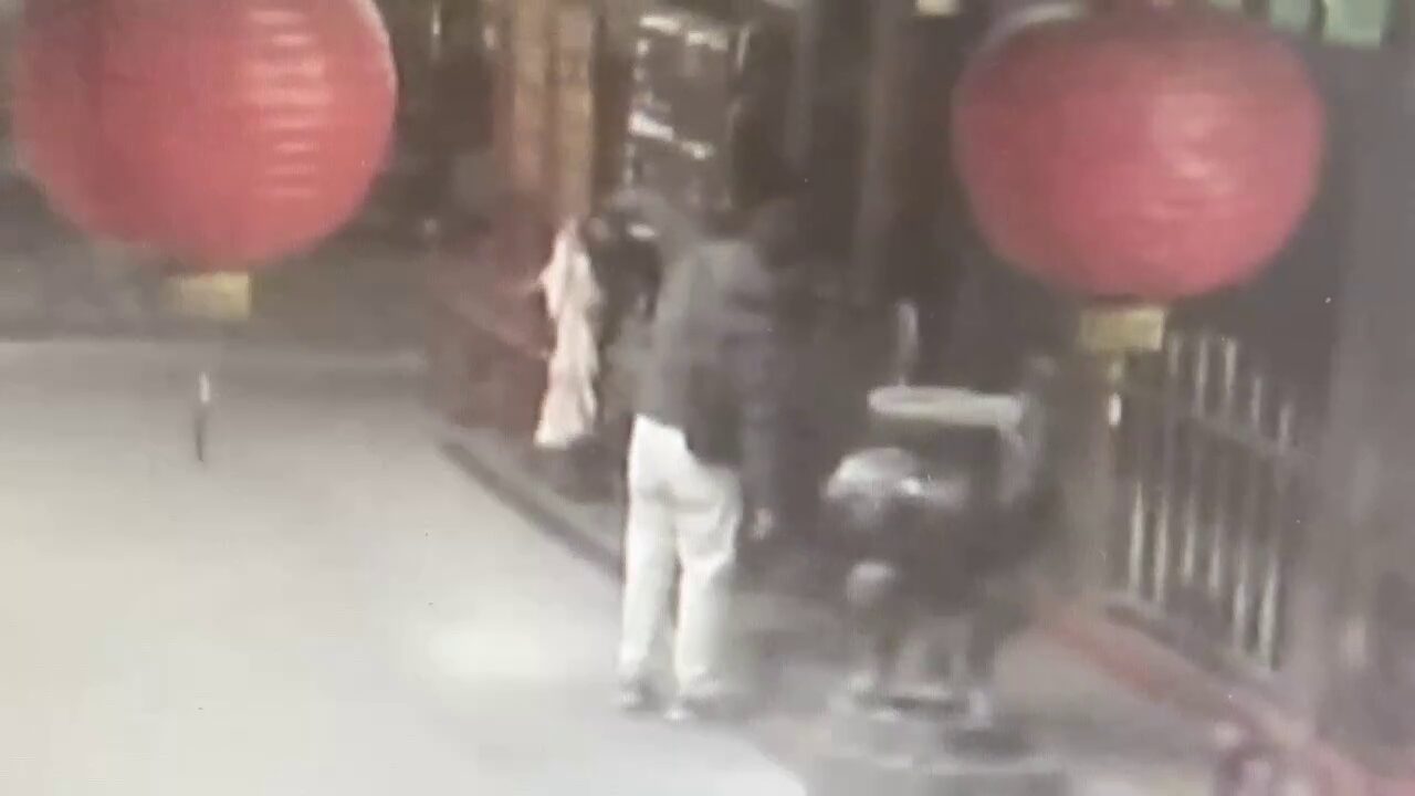 ▲離譜破壞!惡男凌晨闖縣城隍廟「折旗+燒法器」還打天公爐 警方調監視器追查(圖/記者王俊勝 翻攝)