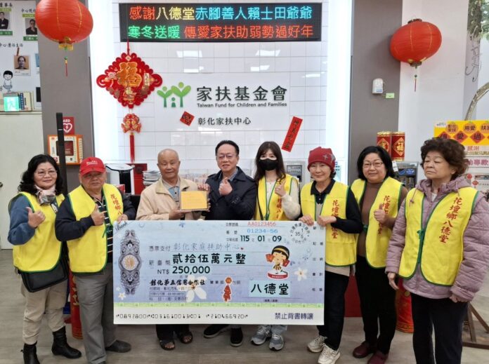 來自花壇鄉八德堂堂主、人稱「赤腳善人」的賴士田先生,9日率領八德堂眾師兄姐,連續第四年親臨彰化家扶,在歲末寒冬之際送上最溫暖的祝福。連續四年來累計善款已達75萬元,赤腳阿公今日親手發放開運紅包,讓家扶兒在寒冬中感受到來自社會的厚實關懷。