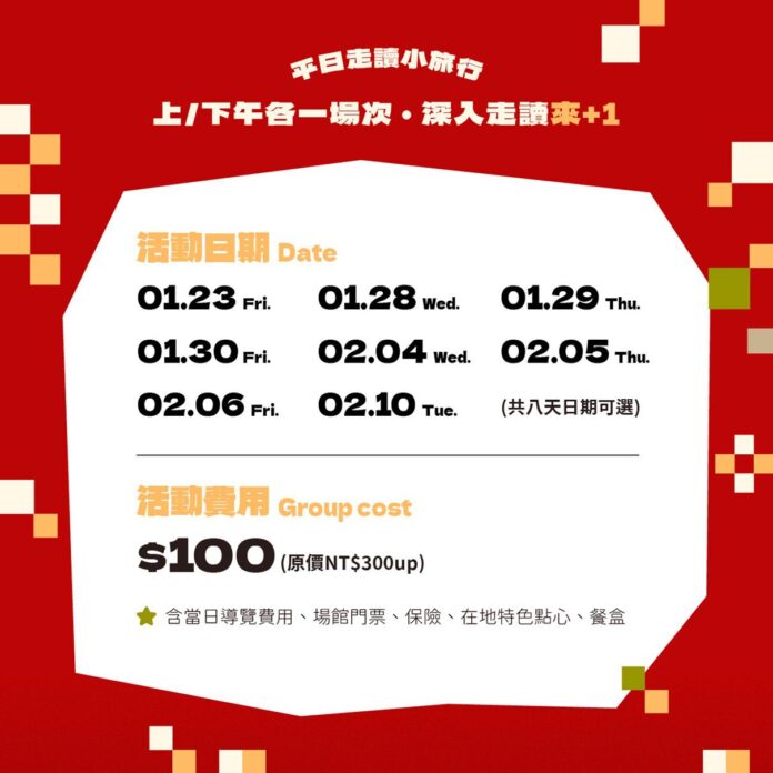 其中,「嘉玩藝術小旅行」以藝術文化為主軸,走訪花磚博物館與嘉義舊監獄宿舍群,並安排木作 DIY 體驗;「科普探索小旅行」則鎖定親子與知性族群,前往嘉義市立博物館及新嘉大昆蟲館,透過導覽與昆蟲主題手作,深入了解自然與科學。另同步推出百元親民的平日走讀小旅行,上午場走訪嘉義公園與嘉義舊監獄,下午場則前往博物館及檜意森活村,共規劃 16 場次,讓城市故事更生動。
