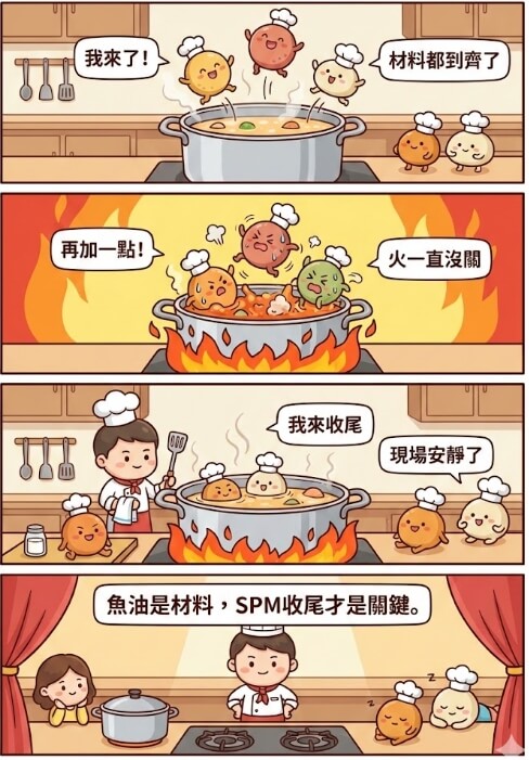 不建議這樣理解。魚油提供的是原料,SPM 則是身體在後段產生的訊號,兩者角色不同。就像煮飯需要食材,也需要流程指令,少了任何一方都不完整。比較好的做法,是把魚油當作基礎支持,同時照顧生活條件,讓身體有能力完成後續調整,而不是在兩者之間二選一。