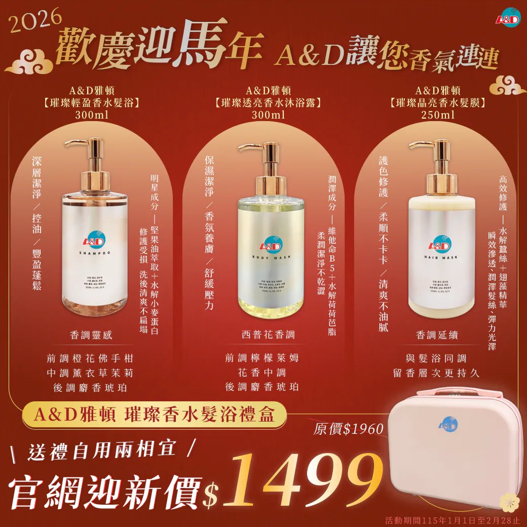 專家指出,台灣消費者對洗髮精、護髮與沐浴乳的需求,正從「功能性」走向,香氛體驗、自我療癒、儀式感生活A&D雅頓的新品布局,正符合市場期待。A&D雅頓表示,將持續推出更多MIT沙龍級洗護產品與造型系列,陪伴消費者透過日常洗護展現健康髮質與自信魅力。「美麗人生,從頭開始」,讓每一次洗髮、護髮與沐浴,都成為迎接新一年的第一步。