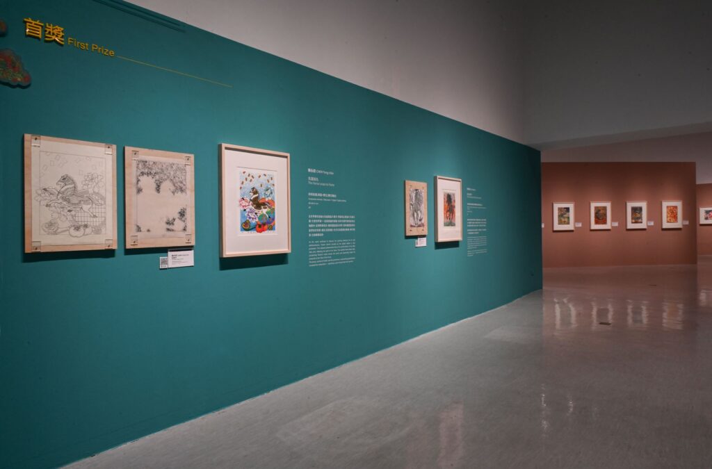 隨著時代演進,年畫的表現形式逐步從傳統象徵吉祥寓意的圖騰符號,拓展為兼具文化意涵與當代視覺語彙的藝術創作,並在當代藝術發展脈絡中,呈現出多樣化的版畫技法與創作形式。本屆首獎優秀創作共6件,分別是金昱慈的〈馬步春風〉,以金馬象徵吉祥勝利,將馬的神格以色彩和裝飾優美的方式呈現;游智涵〈馬奔丙午〉,描繪紅馬駕駛賽車衝向終點的場景,充滿了現代色彩與現代馬的神采;陳永欽〈馬躍揚名〉,呼應臺灣作為晶片生產王國之榮耀,駿馬躍起揚名世界,期望馬年好財運、事事如意;李岳霖〈黑馬贏新年〉,黑馬氣勢磅礡,一條「贏」字金項鍊,期許新的一年奮力向前、「贏」新年;楊振華〈駿馬迎春〉,兩匹駿馬佇立於林間水畔,與周圍繁茂的花草及吉祥富貴的孔雀,呈現春日生機盎然的氛圍;蔡庭歡〈馬踏蘋安轉運來〉,在巨型蘋果造型的旋轉木馬上,三匹駿馬分別乘載「馬上幸福」、「馬上發財」、「馬上平安」,將祝福具象化。