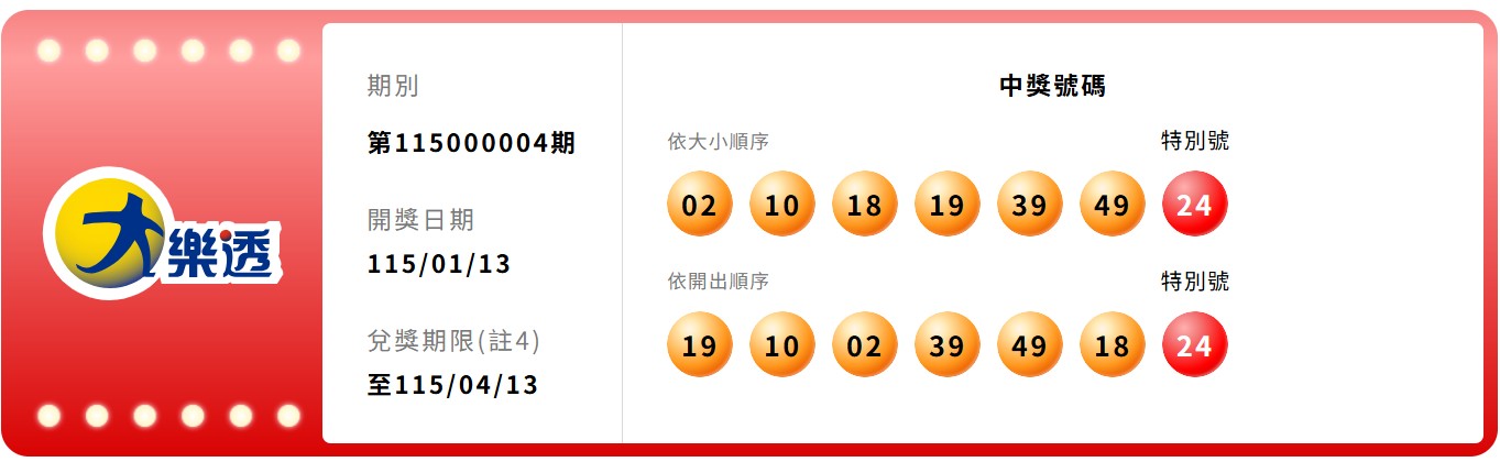 ※大樂透獎號、派彩訊息依台彩公告為主。