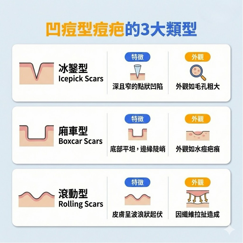 臨床上,我們常將凹陷痘疤分成三種主要形態: