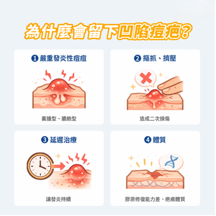 - 成因:中層真皮受損,膠原蛋白流失導致塌陷。