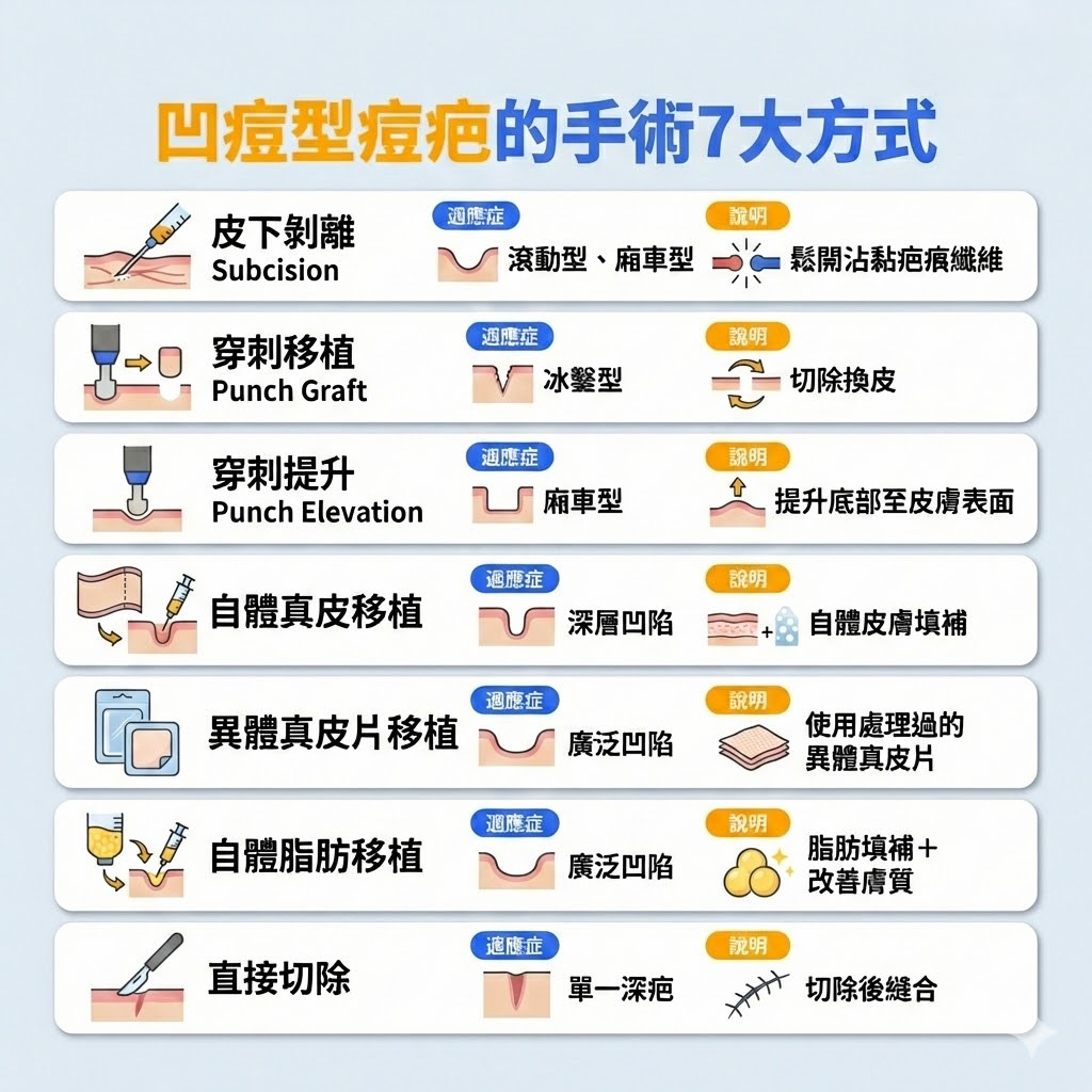 薛榮華表示,每每提到手術治療時,大家總是相當害怕,事實上,手術針對深層或局部頑固型凹陷疤,手術方式往往最有效: