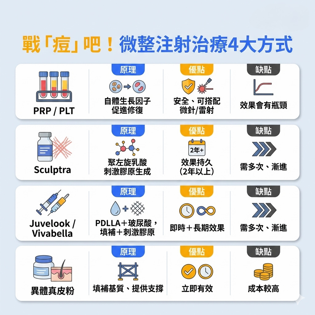 - 優點:安全、自體來源、可搭配微針或雷射加成效果。