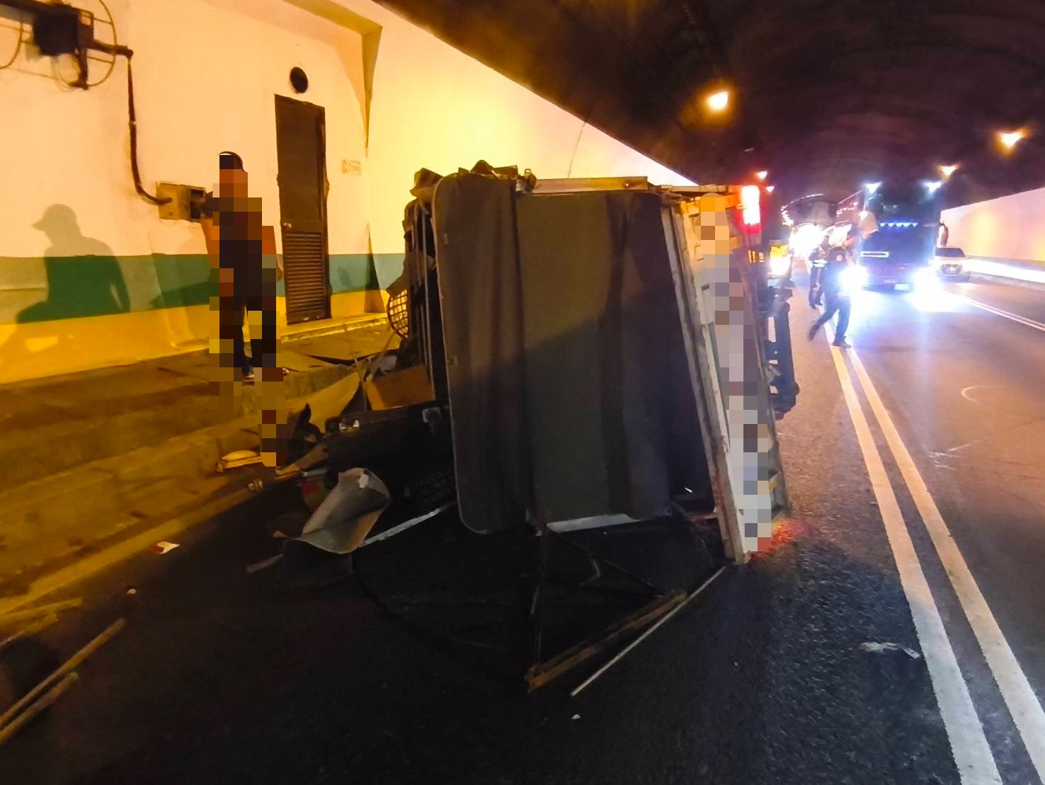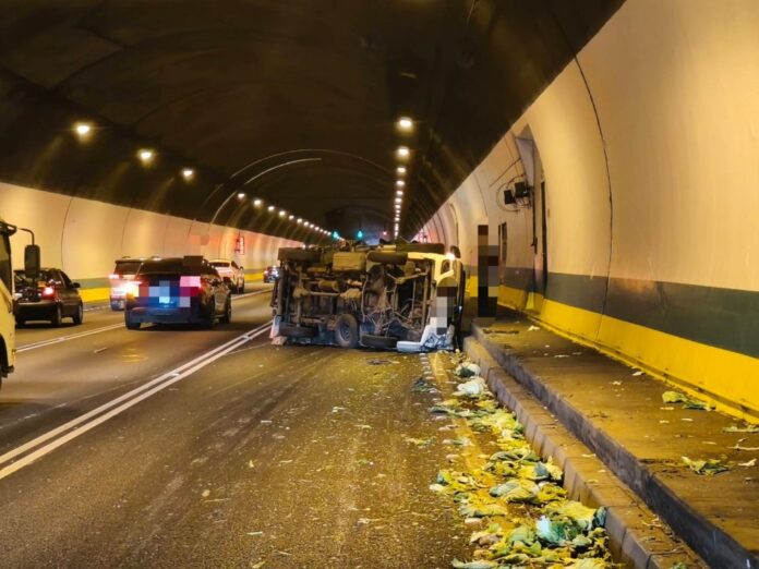國道3號新店隧道內貨車翻覆車上載運青菜掉落路面。翻攝畫面