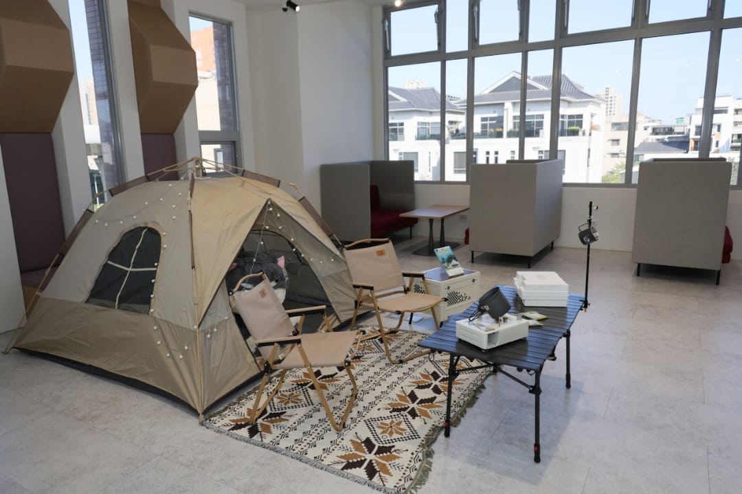 以登山、露營為館藏特色,將帳篷意象融入閱讀,營造戶外紮營的閱讀情境。