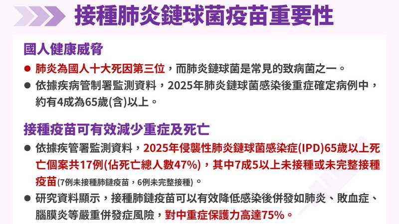 疾管署郭宏偉主任指出,監測資料顯示,國內2025年共累計347例侵襲性肺炎鏈球菌感染症確定病例,其中36例死亡,為近5年新高,而確定病例中以65歲以上民眾約占4成為多。林口長庚醫院邱政洵副院長也說,死亡個案中,高齡者約占7成以上,約4分之3未曾接種疫苗或接種不完整。