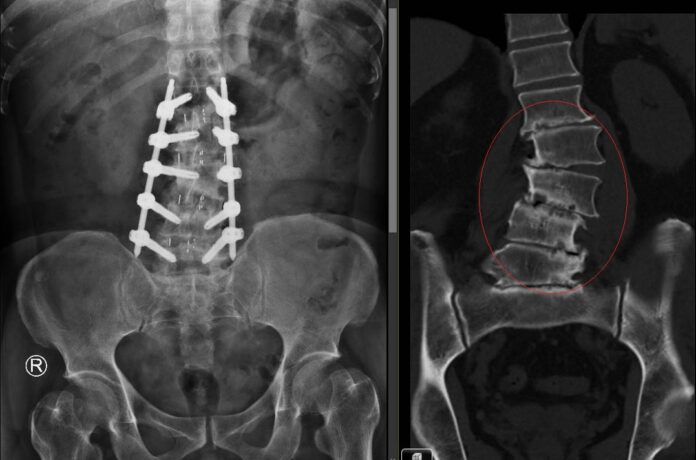 陳柏辰醫師指出,他為胡先生進行新式脊椎微創手術(OLIF),除了清除受損的椎間盤,並植入高分子聚合物的「斜位融合支架」,支撐力是傳統支架的3至5倍,穩固地將萎縮的椎間盤空間撐開,再配合骨釘植入,成功矯治了胡先生的脊椎側彎。