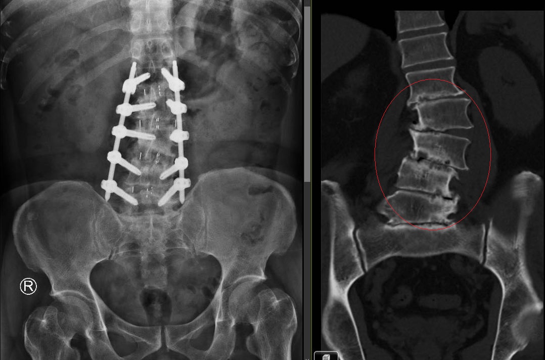 圖說:胡先生第1至第5節腰椎的椎間盤嚴重磨損退化(右)側彎嚴重,經OLIF手術後影像(左)已扶直。