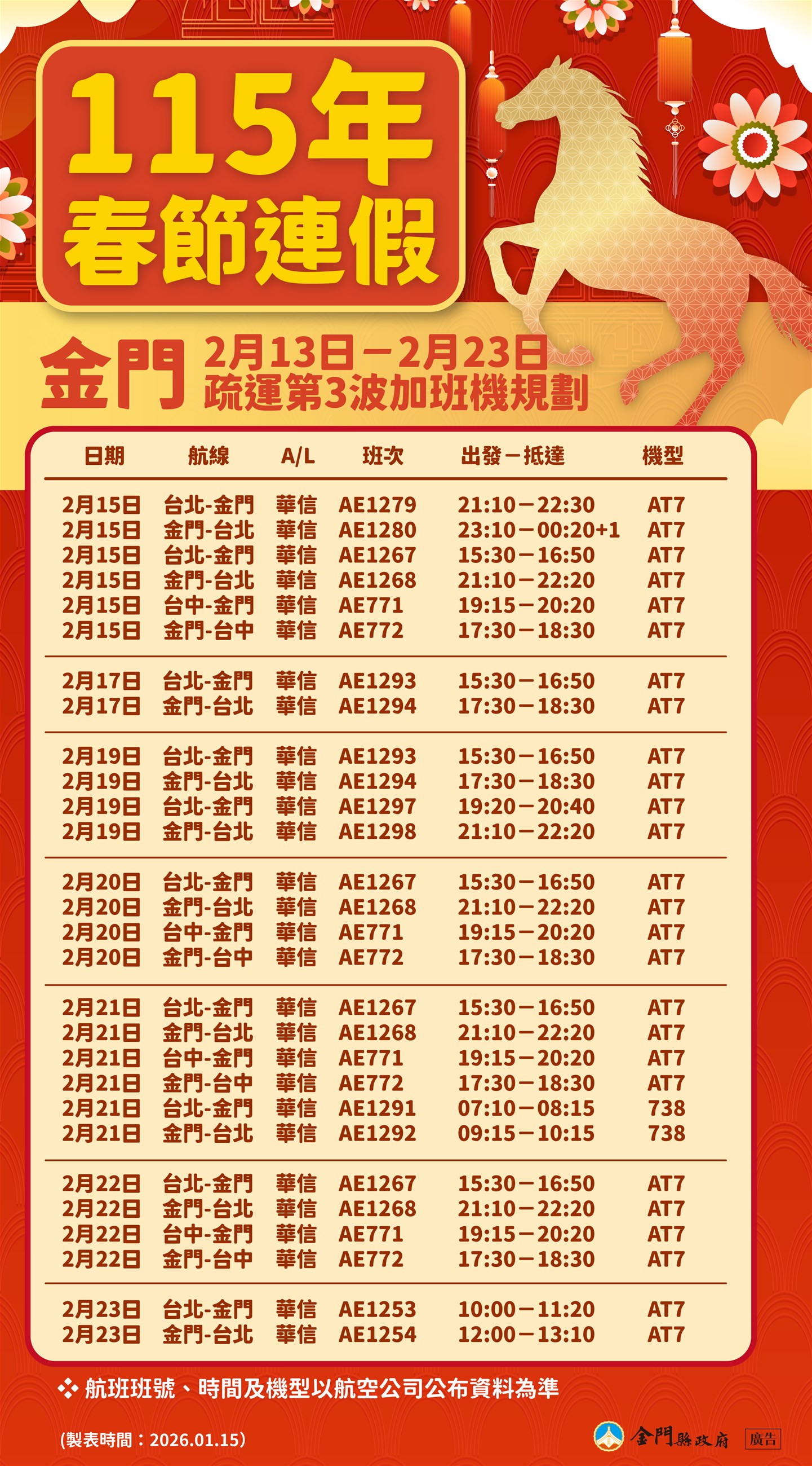 115年春節共9天連假,為期讓鄉親順利返鄉過節,金門縣政府隨即於第2波加班機開放訂位啟動鄉親未訂妥機位需求調查,並於115年1月14日由觀光處許處長績鑫代表陳福海縣長率隊親赴民航局與各航空公司協調春節第3波加班機。