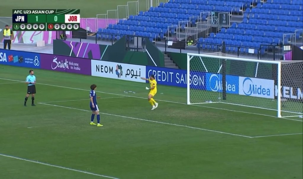 U23亞洲盃八強中,日本隊在十二碼PK大戰中,以4-2的比分淘汰約旦隊晉級四強。而在十二碼第二輪,約旦守門員將日本球員的射門擋下後握拳慶祝,沒想到球被阻擋後仍然飛進身後的球門,裁判認定入球有效。