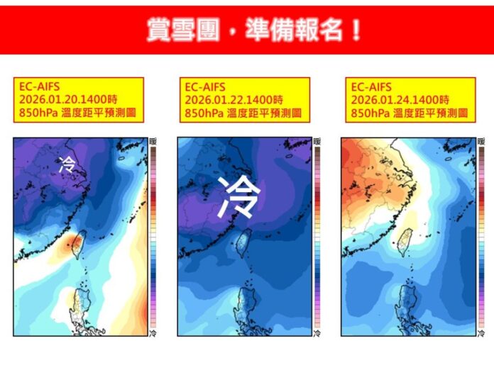 【Lai傳媒、記者爆料網/林千允/綜合報導】賞雪族準備好行程了嗎?先等等,看完天氣再出發!《林老師氣象站》粉專指出,根據歐洲中期天氣預報中心(EC-AIFS)最新數值模式模擬,1月21日(週三)至1月23日(週五),台灣將受到強烈大陸冷氣團或大陸冷氣團影響,冷空氣一波比一波有感,中部以北、宜蘭整天寒冷,其他地區早晚也冷颼颼。