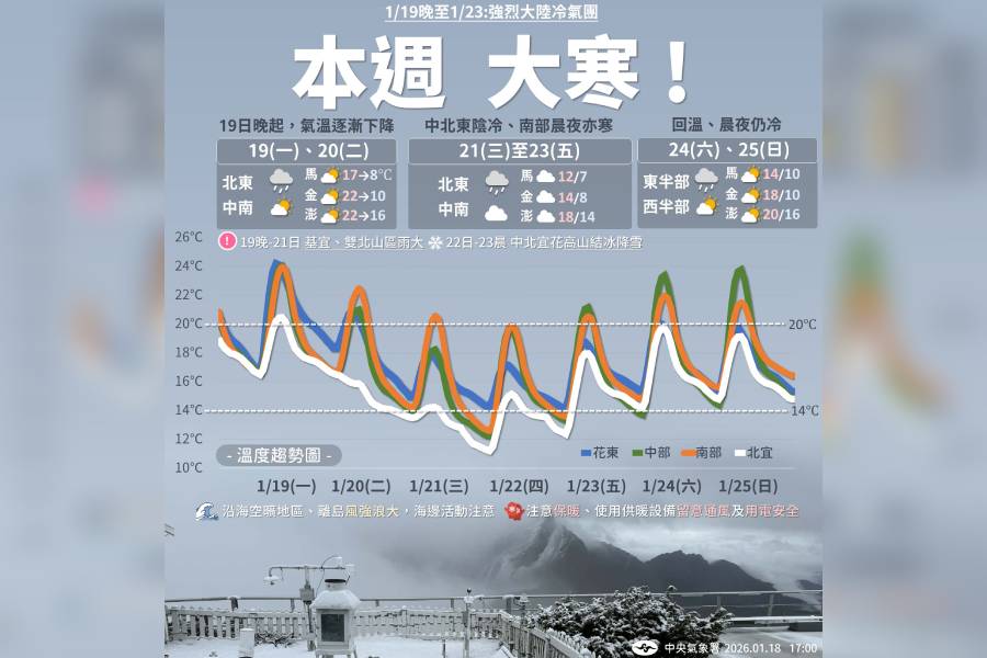 剛過去的這個禮拜氣溫相對溫和,緊接著下周(1/19-1/23)要小心蒙古來的大寒!中央氣象署公布未來一周天氣預報,來自蒙古、西伯利亞的大陸高壓挾帶的冷空氣,將從周一(19日)晚間揮軍南下,周二(20日)開始氣溫下降,而且迎風面的水氣不少,北部、東半部濕冷的感受會很明顯。