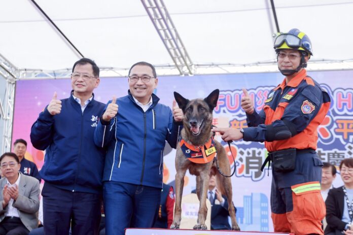▲侯友宜特別授階予搜救犬Aqua,Aqua去(114)年遠征捷克參加「IRO 國際搜救犬世界盃」競賽,自全球38個國家的頂尖隊伍中脫穎而出,在瓦礫堆搜索競賽中榮獲全球第五名。(圖/新北市新聞局 提供)