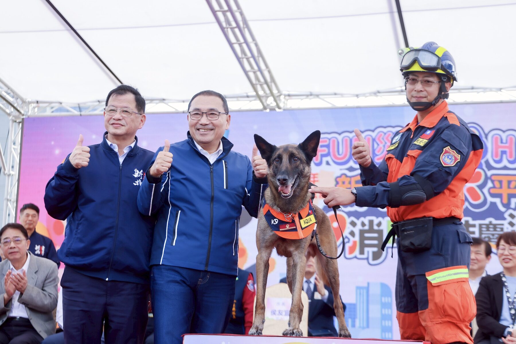 活動中,侯友宜特別授階予搜救犬Aqua並表示,搜救犬隊隊員吳唯逸與Aqua去(114)年遠征捷克參加「IRO 國際搜救犬世界盃」競賽,自全球38個國家的頂尖隊伍中脫穎而出,在瓦礫堆搜索競賽中榮獲全球第五名,非常不容易。此外,新北市義消也在去年全國義勇消防人員體技能交流賽中,勇奪「無人機運用」、「車禍救援」、「繩索救援」三項冠軍,展現厚實的救援量能。