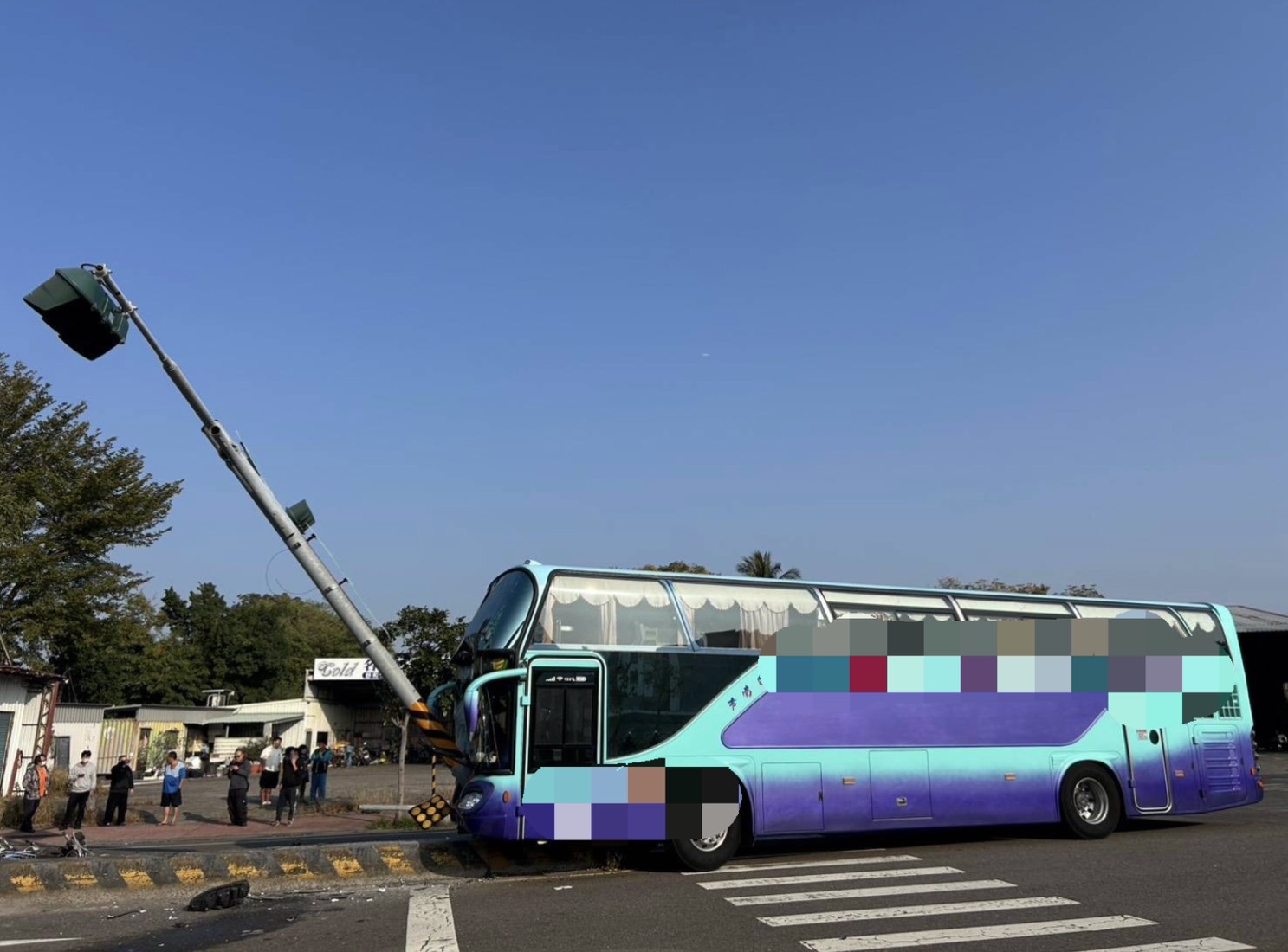 ▲台南交通車撞機車後「再衝分隔島」!車頭全毀撞斷號誌桿 10多員工嚇壞2人送醫(圖/記者王俊勝 翻攝,下同)